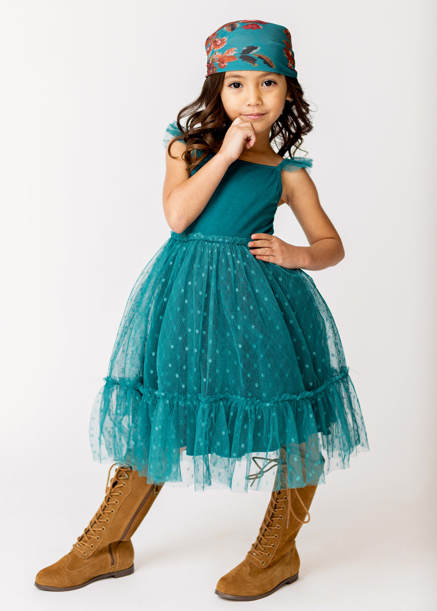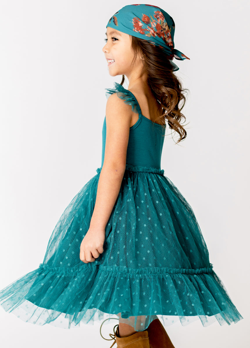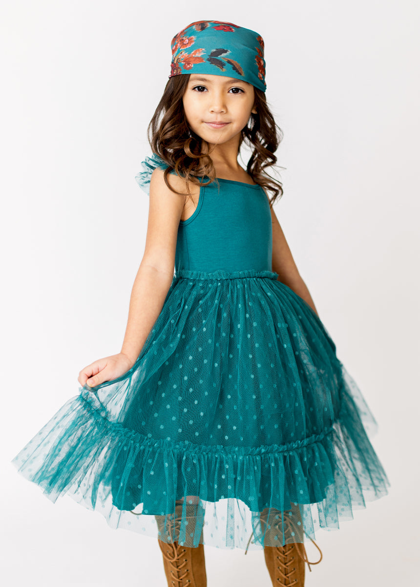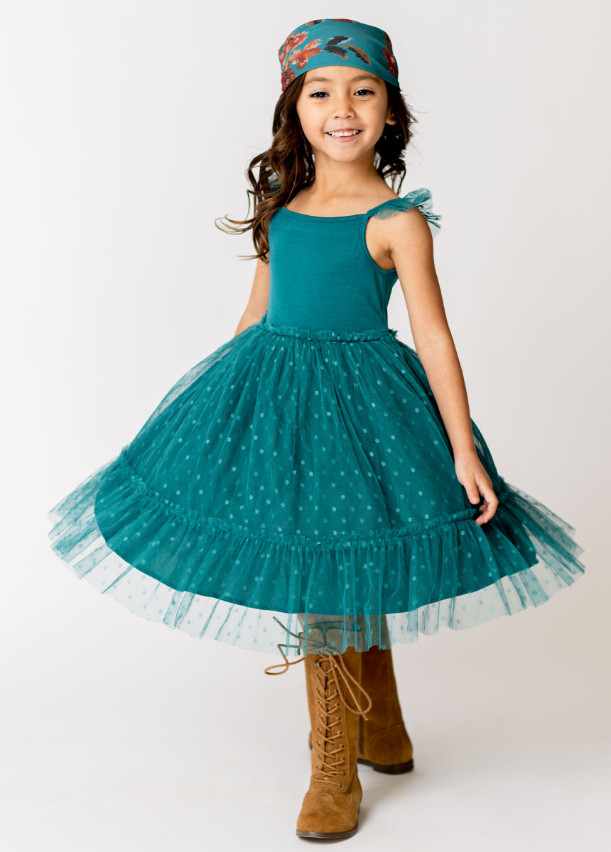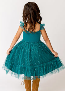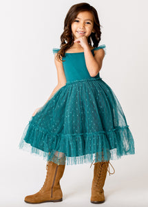 Prepare to make a statement with the beautiful and enchanting Leigh Dress in Teal. This gorgeous ensemble features a tulle skirt and flutter sleeves, bringing a delightful touch to your wardrobe.