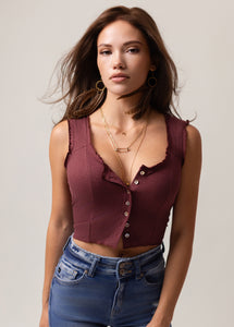 This sleeveless cropped tank top is the ultimate blend of casual edge and effortless style. Designed with a deep scoop neckline and a button-down front with small round buttons, it’s both flattering and versatile. Distressed edges along the neckline, armholes, and hem give it a lived-in, vintage-inspired look that adds personality to any outfit. The cropped fit pairs perfectly with high-waisted jeans, skirts, or shorts for a modern, feminine silhouette. A must-have for layering or wearing solo, this boutique tank top brings a chic yet relaxed vibe to your wardrobe.