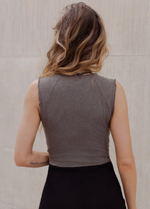 This sleeveless cropped tank top is the ultimate blend of casual edge and effortless style. Designed with a deep scoop neckline and a button-down front with small round buttons, it’s both flattering and versatile. Distressed edges along the neckline, armholes, and hem give it a lived-in, vintage-inspired look that adds personality to any outfit. The cropped fit pairs perfectly with high-waisted jeans, skirts, or shorts for a modern, feminine silhouette. A must-have for layering or wearing solo, this boutique tank top brings a chic yet relaxed vibe to your wardrobe.