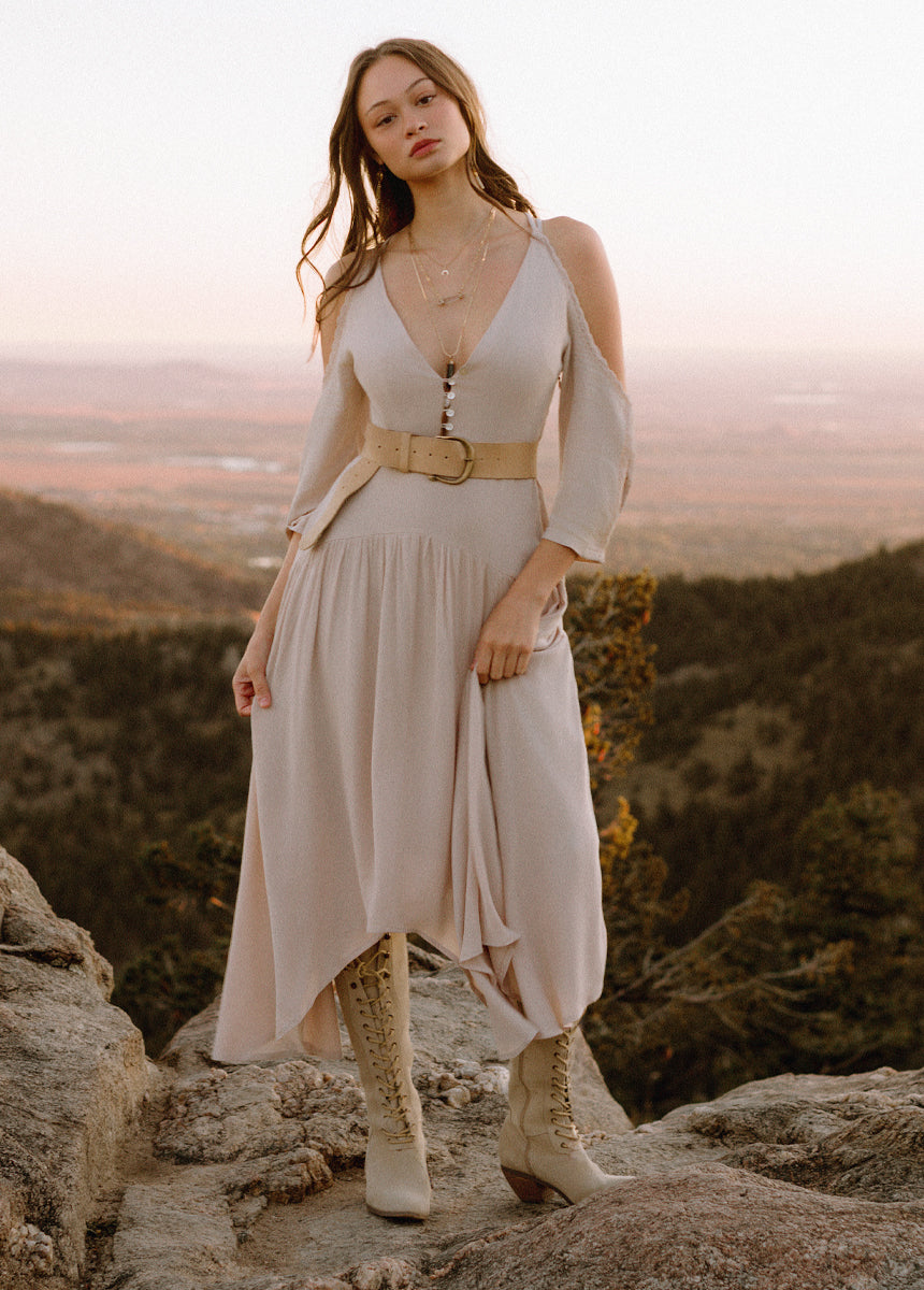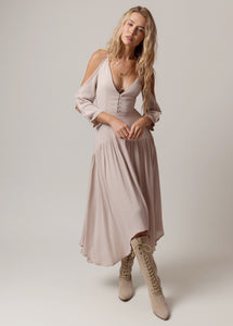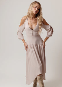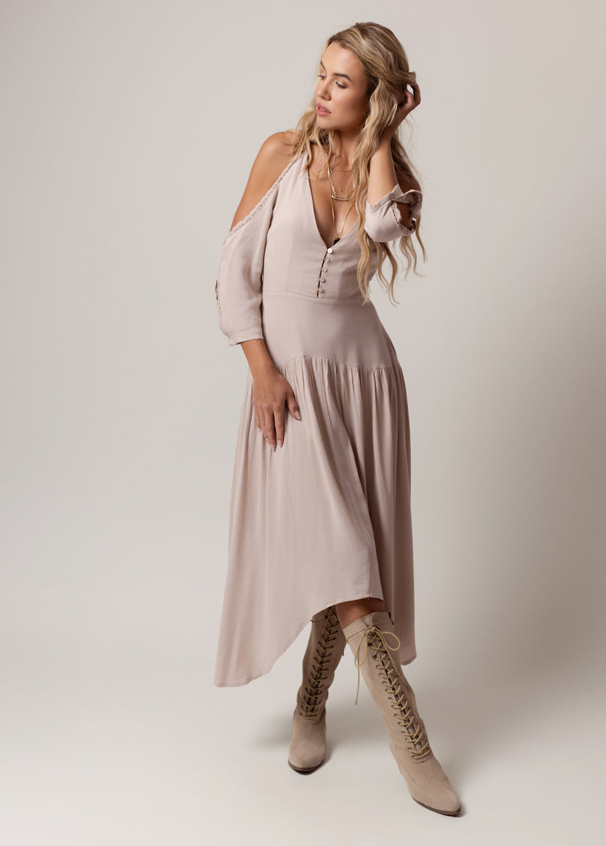 Embrace effortless elegance with this soft-blush cold-shoulder midi dress. Designed with a flattering deep V-neckline and delicate scalloped trim, it perfectly balances romance and sophistication. The fitted bodice with button-front detailing highlights your shape, while the flowy skirt moves beautifully with every step. Lightweight and airy, it’s ideal for warm days or relaxed evenings out. Pair it with boots or strappy sandals for an effortlessly chic, boho-inspired look.