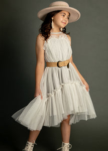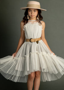 Elevate your little one's style with our stunning Loie Dress in Cream, designed to make her feel like the princess she truly is. This beautiful dress features a high-low midi length that adds a touch of elegance to any occasion. The sweetheart neckline enhances its feminine charm, while the playful bow back adds a delightful detail. With a stretchy waistline, this dress ensures a comfortable fit for all-day play and celebration. Make her special moments even more memorable with the enchanting Loie Dress!