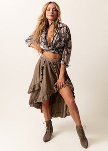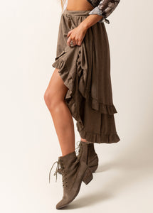 This skirt features a chic cross-front waistband that flatters the waistline with effortless style. The smocked back waistband ensures a comfortable, flexible fit for all-day wear. Soft ruffles cascade beautifully on both sides, adding movement and a romantic touch. Each ruffle is carefully sewn into the skirt with a trendy raw-edge finish for a modern, textured look. Perfect for pairing with elegant tops or casual blouses, this ruffled skirt is a must-have.