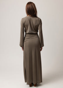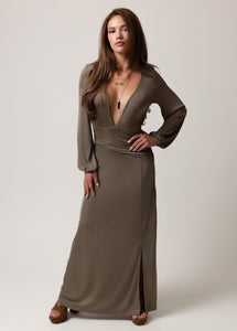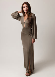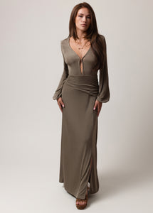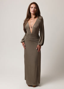 Make a bold statement in this stunning maxi dress, designed with a deep plunging V-neckline for an effortlessly alluring look. The fitted silhouette is enhanced by flattering ruching around the waist and hips, creating a feminine shape that moves with you. Long sleeves with gathered cuffs add a touch of elegance, while the side slit brings just the right amount of drama. A hook-and-eye closure at the bust and a built-in mini skirt liner provide comfort and coverage without compromising style. Perfect for evenings out, date nights, or special events, this boutique maxi dress blends sophistication with modern allure.