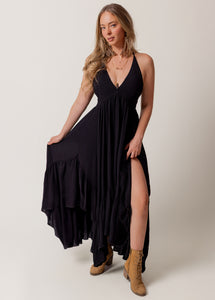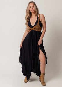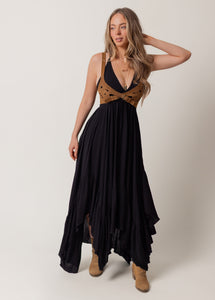 This dreamy boutique dress features a delicate triangle cup bralette trimmed with romantic lace for an ultra-feminine look. Double crisscross straps connect to a central ring at the upper back, creating a striking T-back silhouette with adjustable details for a perfect fit. The midi-length skirt showcases multiple asymmetrical tiers of gathered and pleated fabric, offering elegant movement and texture. An irregular ruffle hem adds a whimsical, modern touch to the classic boho-inspired design. Perfect for special occasions or elevated everyday wear, this boutique midi dress blends soft structure with intricate detail for a standout feminine style.