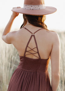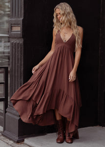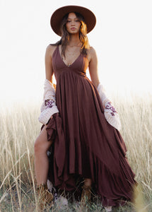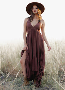 This dreamy boutique dress features a delicate triangle cup bralette trimmed with romantic lace for an ultra-feminine look. Double crisscross straps connect to a central ring at the upper back, creating a striking T-back silhouette with adjustable details for a perfect fit. The midi-length skirt showcases multiple asymmetrical tiers of gathered and pleated fabric, offering elegant movement and texture. An irregular ruffle hem adds a whimsical, modern touch to the classic boho-inspired design. Perfect for special occasions or elevated everyday wear, this boutique midi dress blends soft structure with intricate detail for a standout feminine style.