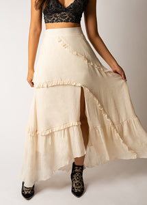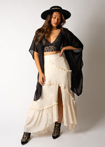 Featuring a playful asymmetrical hem, this beautiful skirt will pair perfectly with your favorite booties or heels!