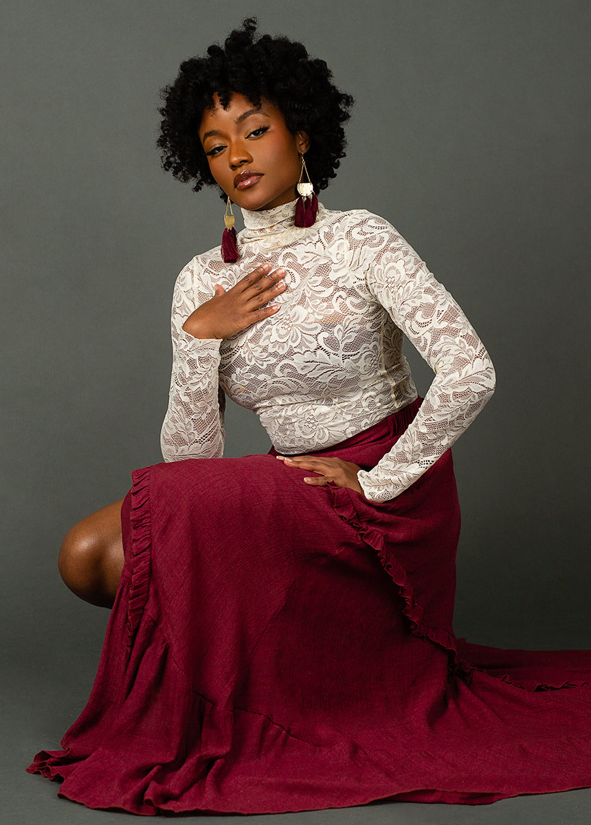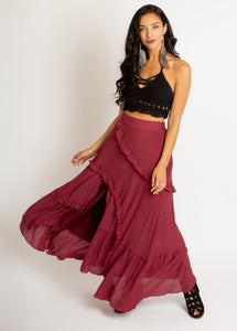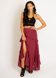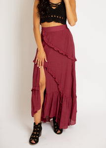Featuring a playful asymmetrical hem, this beautiful skirt will pair perfectly with your favorite booties or heels!
