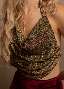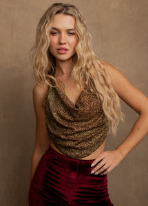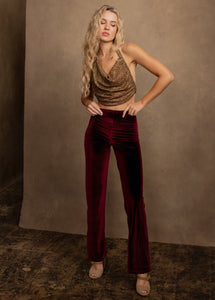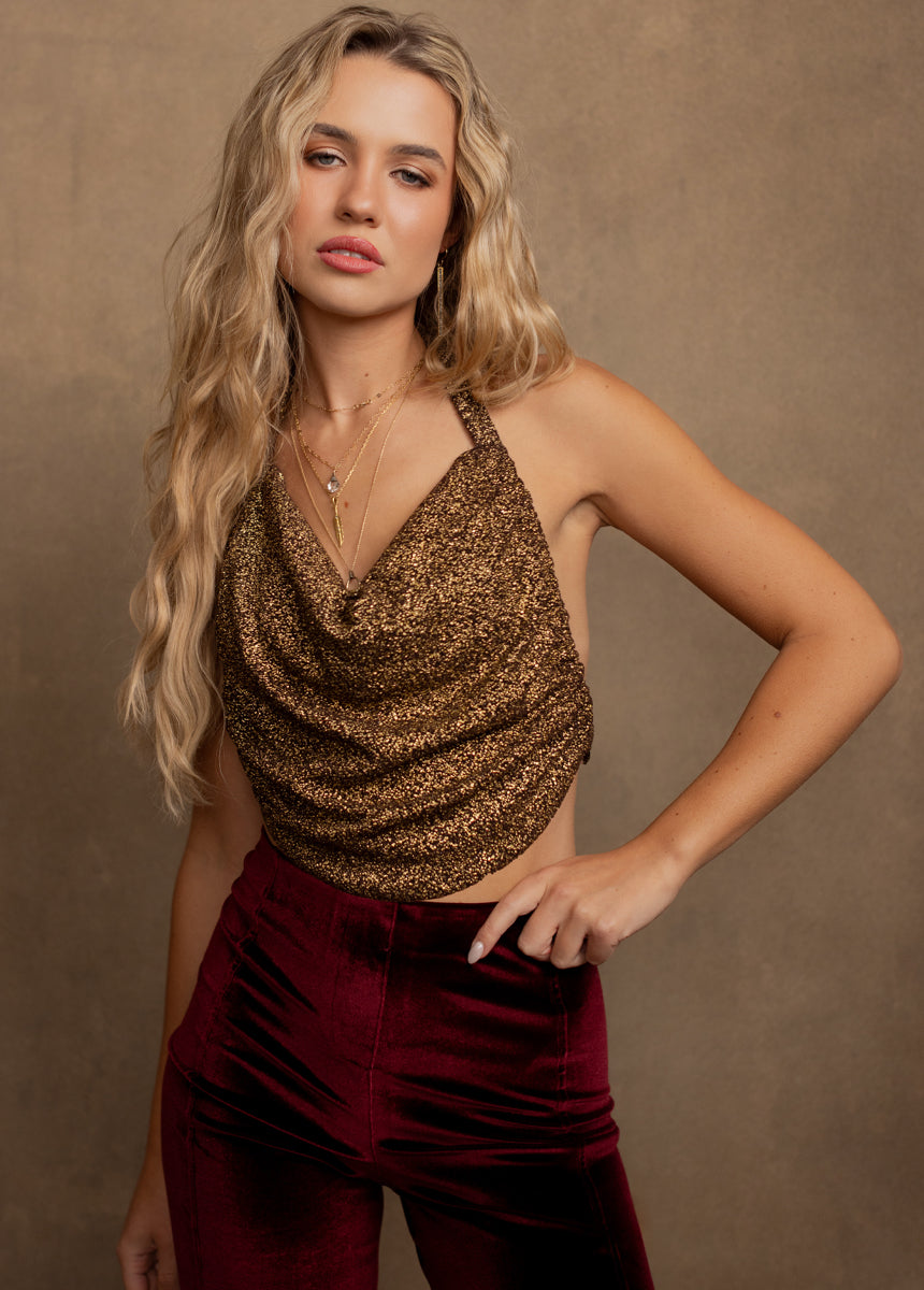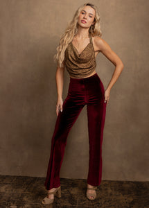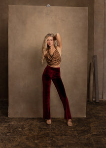 This chic two-piece set combines effortless elegance with modern tailoring. The top features a draped cowl neckline and wide halter straps that frame the shoulders beautifully, while the fitted ruched bodice flatters the figure and flows into a sleek open back with a clean finish. The matching pants are designed with a high-rise waistline and a wide-leg cut that elongates the silhouette. A centre seam detail and single welt pocket add subtle structure and sophistication. Finished with a clean hem, this set is perfect for elevating your day-to-night wardrobe.