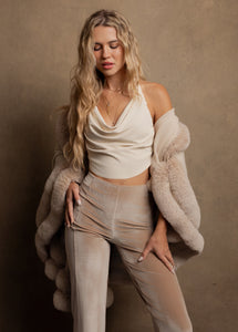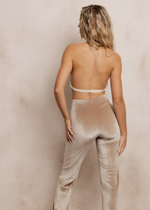 This chic two-piece set combines effortless elegance with modern tailoring. The top features a draped cowl neckline and wide halter straps that frame the shoulders beautifully, while the fitted ruched bodice flatters the figure and flows into a sleek open back with a clean finish. The matching pants are designed with a high-rise waistline and a wide-leg cut that elongates the silhouette. A centre seam detail and single welt pocket add subtle structure and sophistication. Finished with a clean hem, this set is perfect for elevating your day-to-night wardrobe.