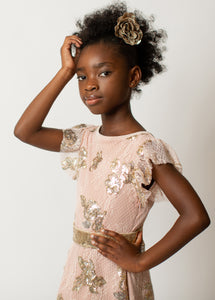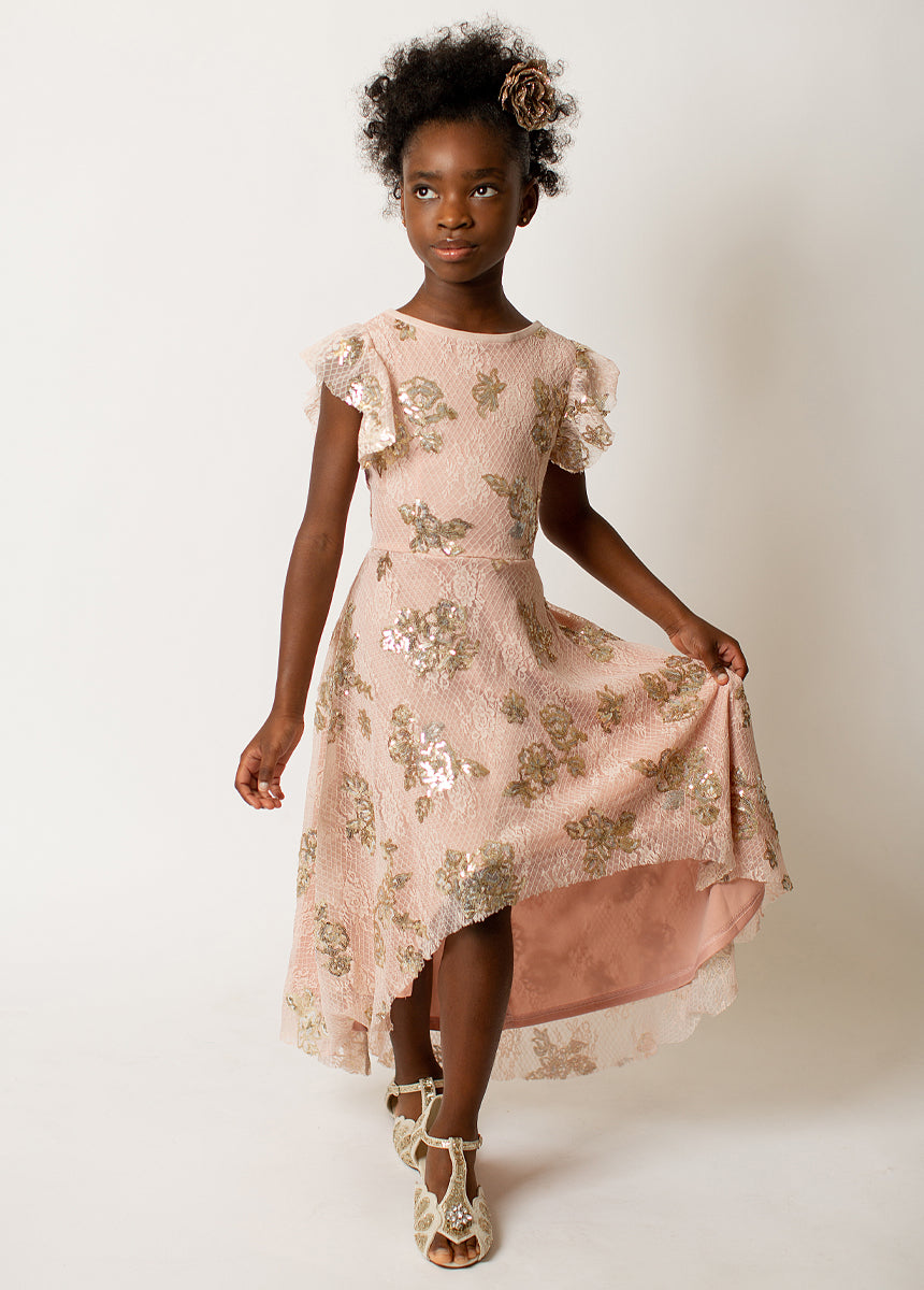 A sparkly and lacy dream of a dress, with an easy silhouette and unique, irregular hem.