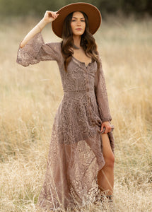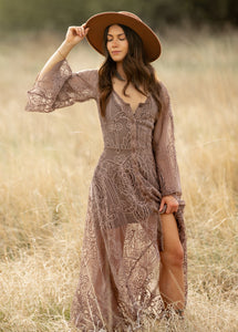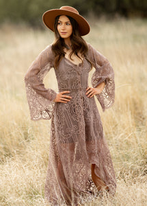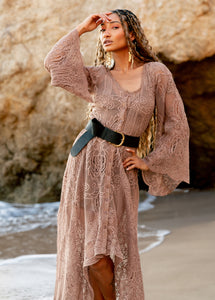 Embrace your bohemian side with the Mentari Dress in Mushroom. Its lovely crochet lace design and charming bell sleeves bring a hint of magic to any ensemble. It also doubles as a boho duster when left unbuttoned, making it ideal for music festivals or a day spent by the sea.