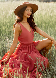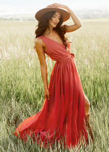 With a maxi length, sleeveless silhouette, and a flattering v-neckline, the Miriam Dress exudes sophistication and timeless elegance. The tie at the waist adds a touch of feminine charm.