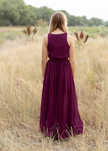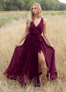 With a maxi length, sleeveless silhouette, and a flattering v-neckline, the Miriam Dress exudes sophistication and timeless elegance. The tie at the waist adds a touch of feminine charm.