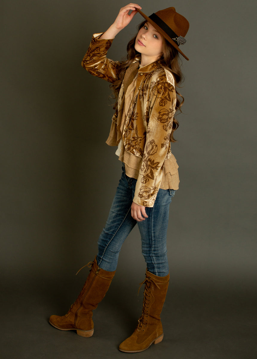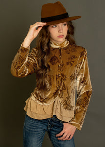 Add a rich velvet jacket to her wardrobe featuring an exquisite floral print.