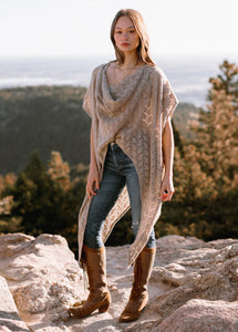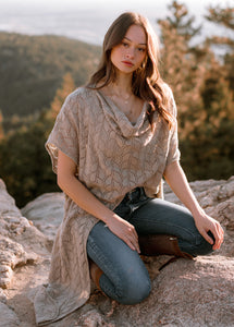 Wrap yourself in effortless style with this open-knit poncho top. Designed with a soft cowl neckline and delicate lace-like pattern, it drapes beautifully for a relaxed, bohemian feel. The lightweight fabric makes it perfect for layering over fitted tops or dresses, adding texture and charm to any outfit. Its flowy, asymmetrical hem creates graceful movement with every step. Belt it at the waist for a flattering silhouette or wear it loose for a laid-back, free-spirited look.
