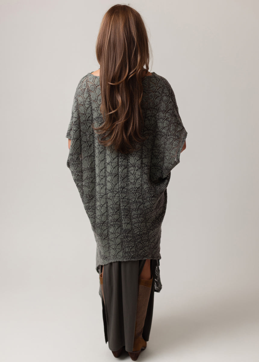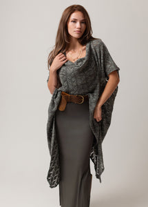 Wrap yourself in effortless style with this open-knit poncho top. Designed with a soft cowl neckline and delicate lace-like pattern, it drapes beautifully for a relaxed, bohemian feel. The lightweight fabric makes it perfect for layering over fitted tops or dresses, adding texture and charm to any outfit. Its flowy, asymmetrical hem creates graceful movement with every step. Belt it at the waist for a flattering silhouette or wear it loose for a laid-back, free-spirited look.