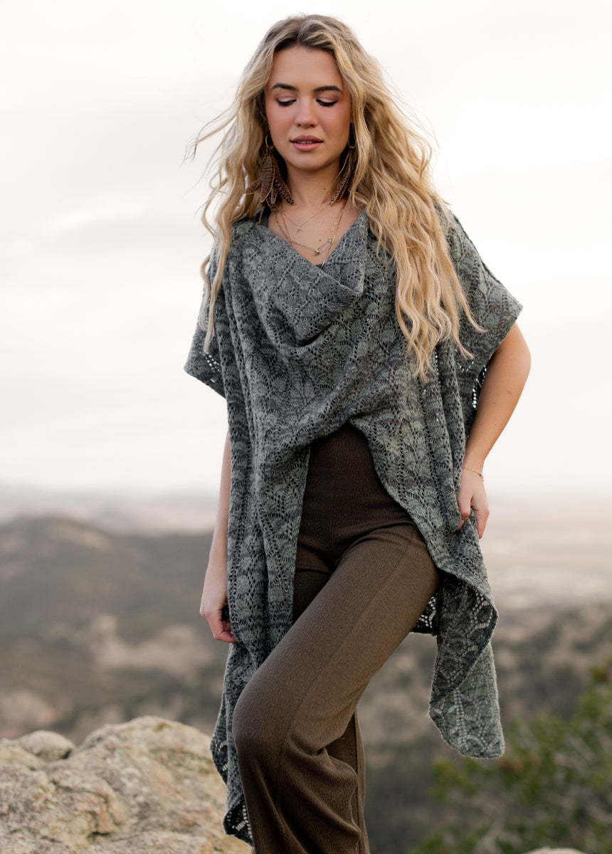 Wrap yourself in effortless style with this open-knit poncho top. Designed with a soft cowl neckline and delicate lace-like pattern, it drapes beautifully for a relaxed, bohemian feel. The lightweight fabric makes it perfect for layering over fitted tops or dresses, adding texture and charm to any outfit. Its flowy, asymmetrical hem creates graceful movement with every step. Belt it at the waist for a flattering silhouette or wear it loose for a laid-back, free-spirited look.
