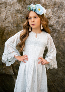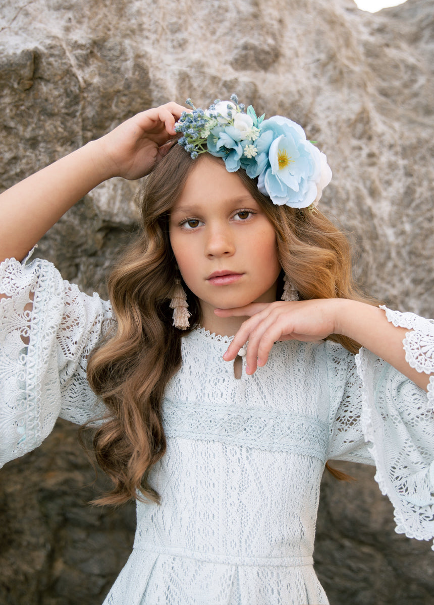 This Murni Dress in Blue Whisper is the perfect combination of girly and feminine, with soft crochet lace detailing. Embrace a playful and girly style with this dress that is sure to turn heads. Perfect for any occasion, this dress will have you feeling confident and stylish.