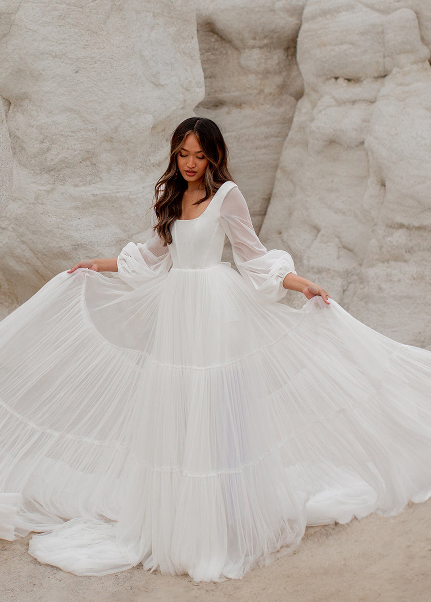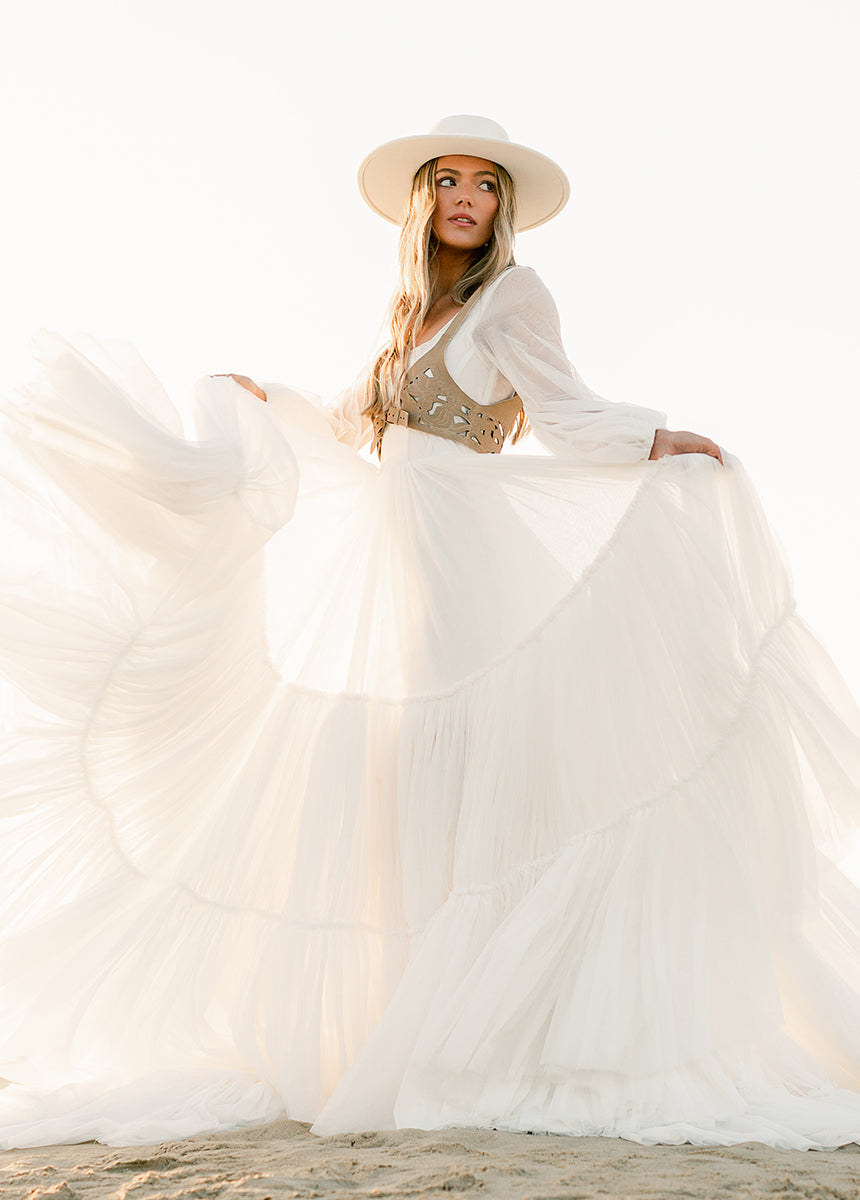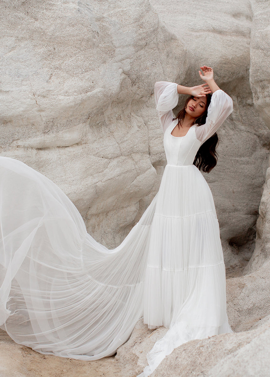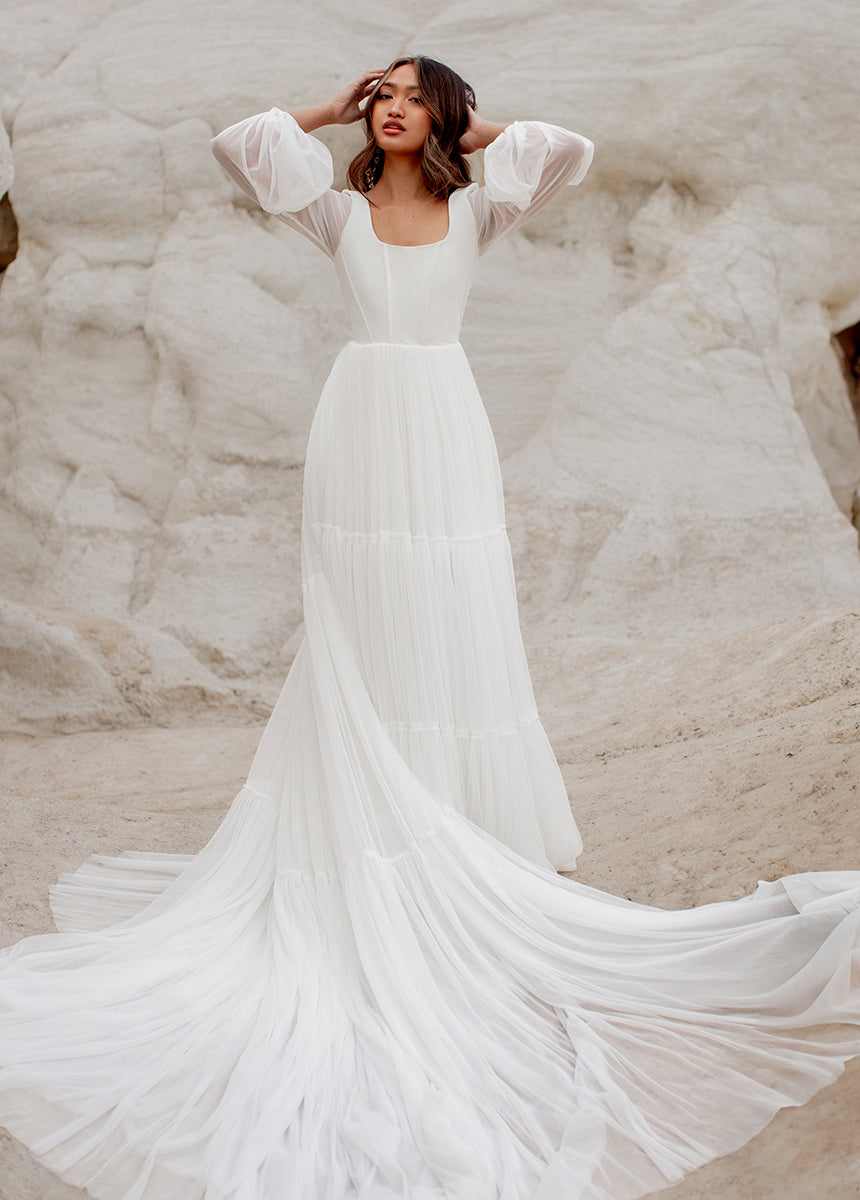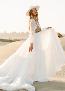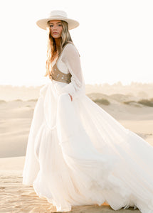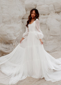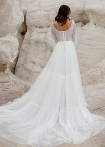 Meet Natalya, the dress dreams are made of! With a unique combination of billowing sleeves cascading down and a delicate, ethereal sheer layer that adds a touch of mystery and grace. A Corseted bodice combined with a large ruffled tulle sweep designed to be floating in the wind. Natalya was designed with an essence of romance and bohemian spirit that will be unforgettable.