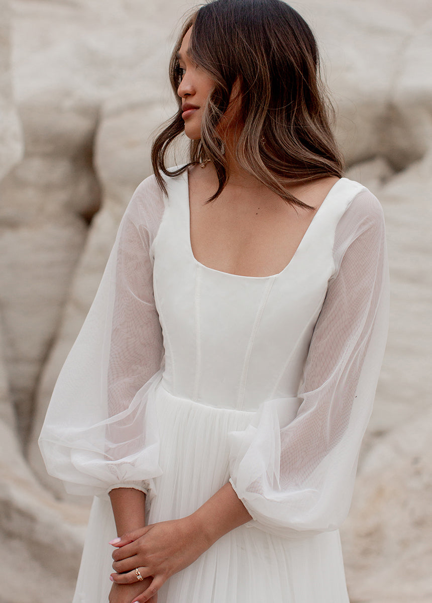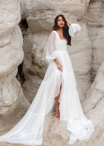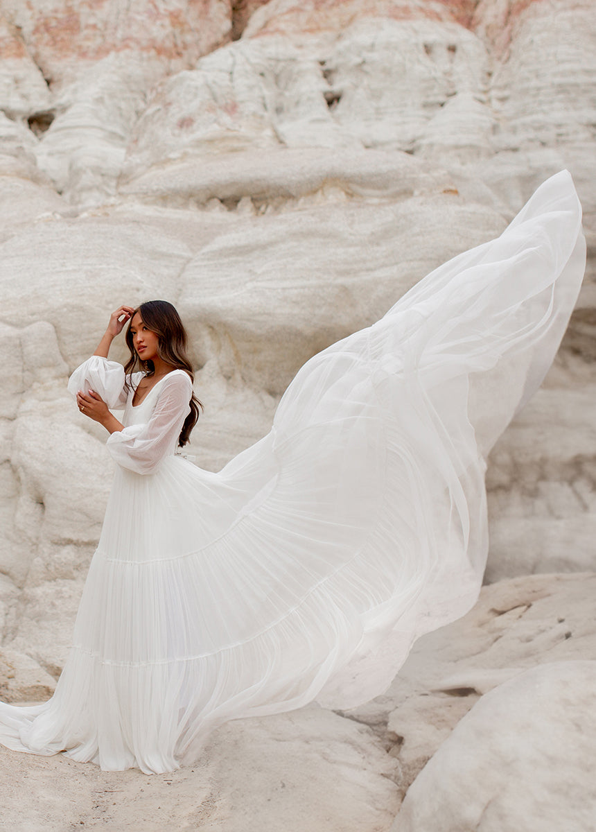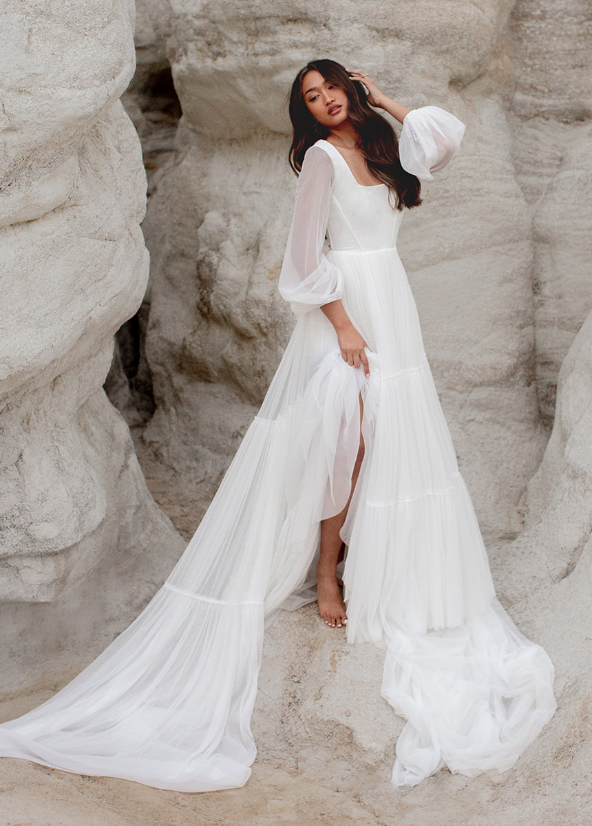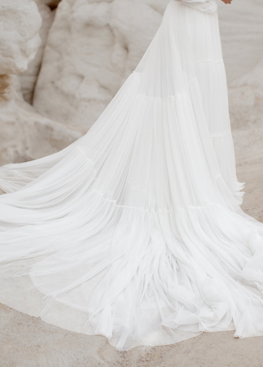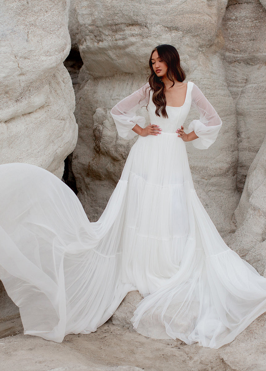 Meet Natalya, the dress dreams are made of! With a unique combination of billowing sleeves cascading down and a delicate, ethereal sheer layer that adds a touch of mystery and grace. A Corseted bodice combined with a large ruffled tulle sweep designed to be floating in the wind. Natalya was designed with an essence of romance and bohemian spirit that will be unforgettable.
