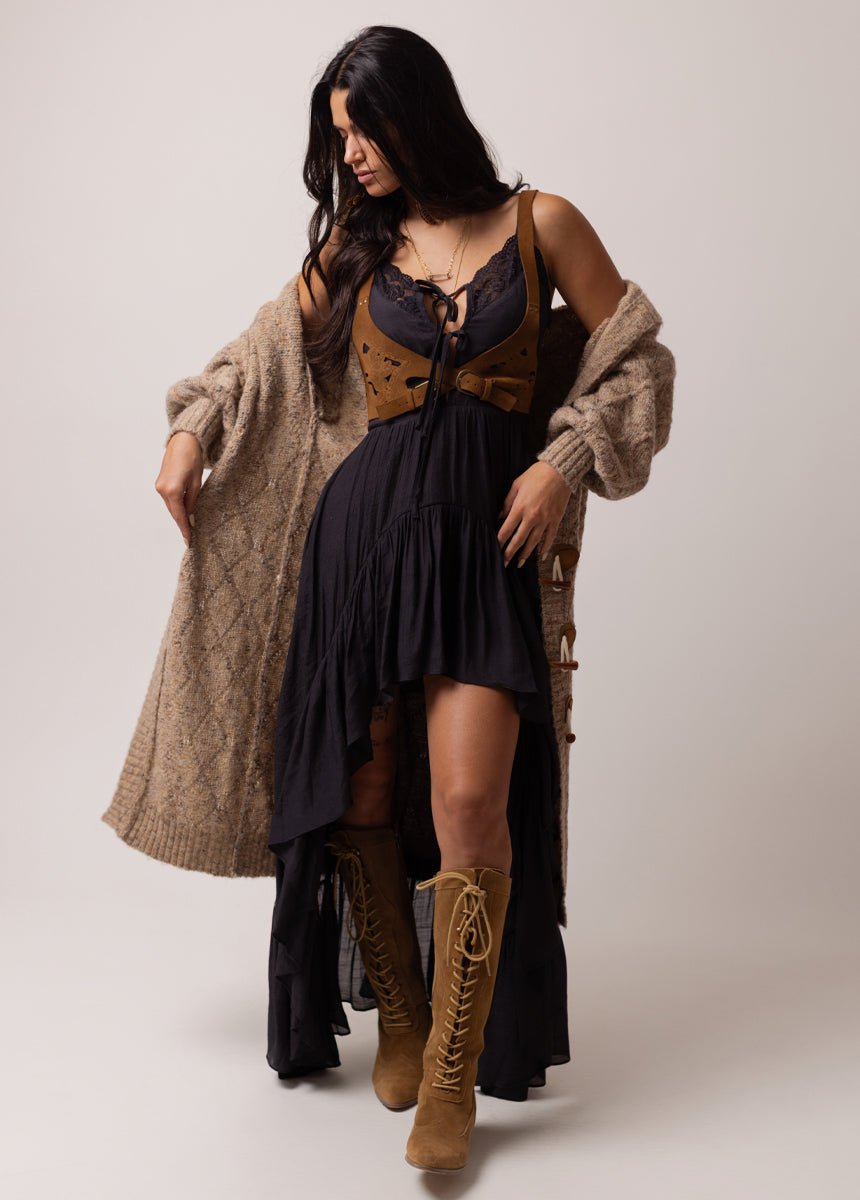 This feminine boutique dress features clean-finish straps with delicate lace trim that highlight the neckline beautifully. Princess seams shape the bodice for a flattering fit, while an invisible side zipper keeps the look sleek and seamless. A high-low hemline adds modern movement, finished with a soft baby hem for a polished touch. The seamed-in ruffle along the hem brings a playful, romantic detail that feels effortlessly chic. Perfect for special occasions or elevated everyday wear, this lace-trim dress is a timeless addition to any women’s boutique wardrobe.