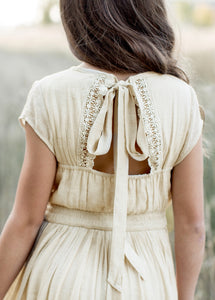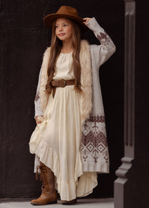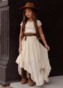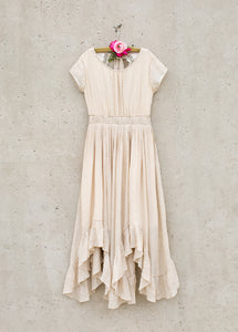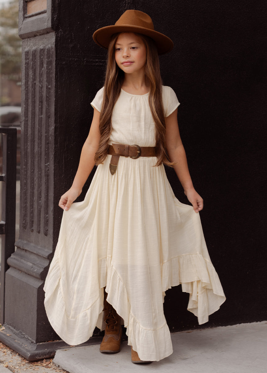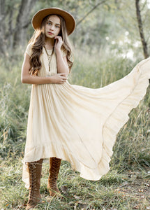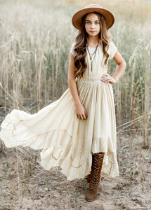 Make her feel effortlessly elegant in this boho maxi dress, perfect for your girls' wardrobe. Featuring short capped sleeves and a high-low hem with gathered ruffles, this dress offers a stylish, twirl-worthy design. The smocked waist ensures a comfortable and flattering fit, while the lace trim and tie at the back neckline add charming details. Crafted for special occasions or casual outings, this dress pairs beauty with comfort. Add this timeless boho maxi dress to her wardrobe for an enchanting look she'll love!