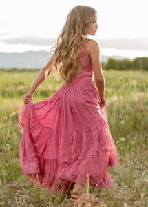 Look effortlessly elegant and playful all at once with this fan favorite boho maxi dress. Featuring a full tiered skirt with lace ruffles and a scalloped lace detail in the back. A soft rayon adorned with soft lace, this dress zips up the side with a beautiful tie at the back neckline and elastic cinch back for an easy fit.