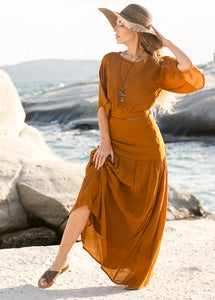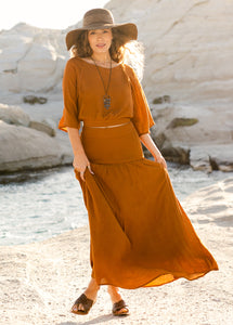 This spicy burnt orange shade is perfect for Fall photos. Well made and comfortable on my body. I'm normally a size medium in Joyfolie dresses with zippers and no stretch. They were out of the medium so I ordered the large. I am wearing this for a photo session with my 4 daughters and the large will do just fine. I figured worst case scenario, I could pin the skirt tighter if needed and it'd be covered up by the Kenzie Sweater in Heather Slate that I'm wearing with it, since it's a baggy look. The medium would still be my typical size in this skirt if I wanted it to stay in place as a high waisted skirt. The large just slides down and rests on my hips but it's not going to fall off by any means, just makes it a little longer. Overall, I'm happy with the choice I made! For reference: I'm 5'5 with a 30in waist and 38" hips (literally measured today so it's legit), 34D chest.