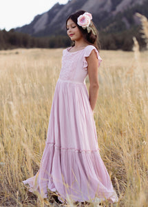 This fan-favorite maxi dress features a beautifully soft and full tiered skirt, making it a stunning choice for any occasion. The bodice is elegantly embellished with a delicate lace panel and accented with crochet trim throughout, adding a touch of sophistication. Designed with a center back invisible zipper, it offers a seamless look and easy wear. With flutter sleeves and a large sweep, this maxi-length dress provides both comfort and style. Crafted from a blend of 65% rayon and 35% polyester for the self, with 100% polyester for the lining and lace, it's machine washable (inside out) and easy to care for, ensuring your little looks fabulous with minimal effort.