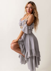 This stunning off-the-shoulder dress features a slight V-shaped neckline adorned with delicate uneven ruffles for a romantic touch. The elegant scoop back adds a hint of allure while ensuring a flattering fit. Front and back princess seams enhance the feminine silhouette, creating a beautifully tailored look. A layered skirt adds graceful movement, making it perfect for special occasions or chic everyday wear. Designed for modern women, this dress combines timeless elegance with effortless charm.