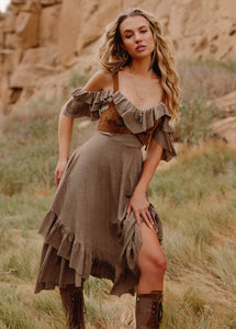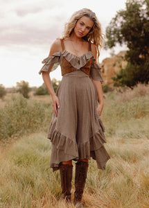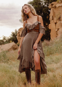 This stunning off-the-shoulder dress features a slight V-shaped neckline adorned with delicate uneven ruffles for a romantic touch. The elegant scoop back adds a hint of allure while ensuring a flattering fit. Front and back princess seams enhance the feminine silhouette, creating a beautifully tailored look. A layered skirt adds graceful movement, making it perfect for special occasions or chic everyday wear. Designed for modern women, this dress combines timeless elegance with effortless charm.