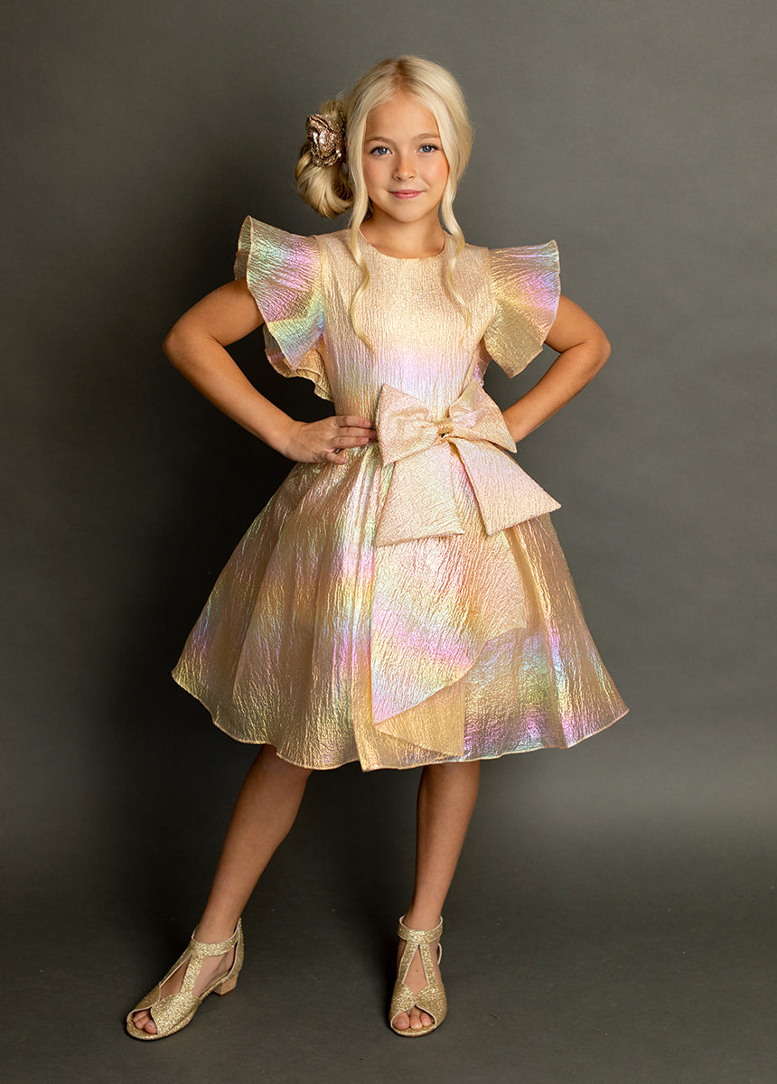 Complete her look with our Orelia Heel for your little one, featuring gold glitter. Crafted for both comfort and style, this heel ensures your little girl stands out with grace and confidence.