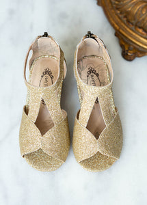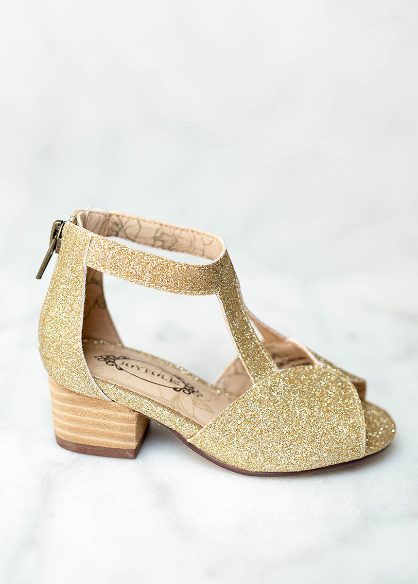 Complete her look with our Orelia Heel for your little one, featuring gold glitter. Crafted for both comfort and style, this heel ensures your little girl stands out with grace and confidence.