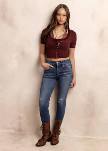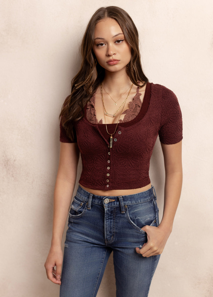 This timeless top brings together classic tailoring and everyday elegance. It features a flattering scoop neckline with a clean double topstitch finish and a centre front placket accented by nine delicate buttons. The elbow-length sleeves and straight hem are detailed with matching topstitching for a polished, cohesive look. Designed with a fitted silhouette and subtle shaping through the waist, it flatters the figure effortlessly. Finished with a simple, clean back this versatile piece transitions seamlessly from work to weekend.