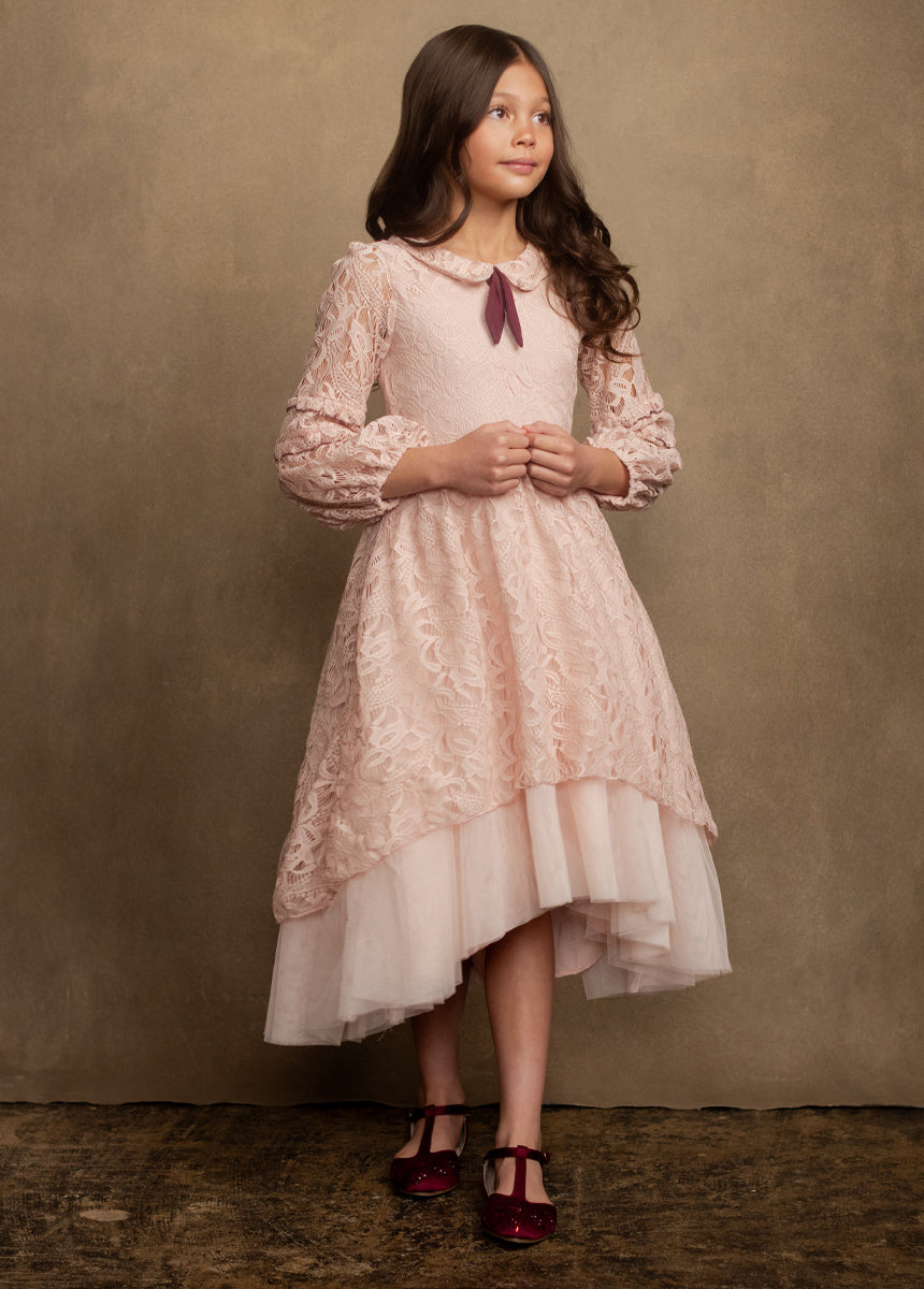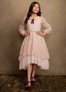 Vintage inspired, this petticoat dress features a bishop sleeve, peter pan collar, & merrow edge finishing.