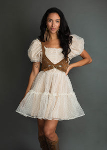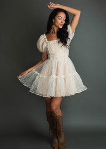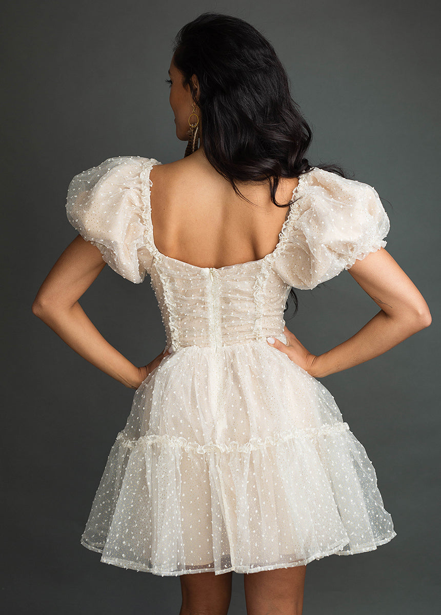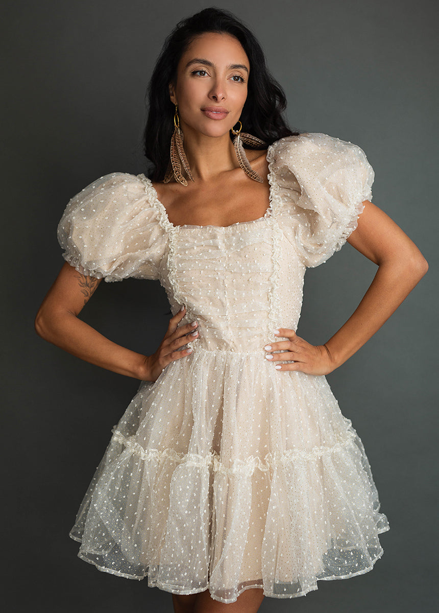 Embrace your playful side with our feminine Perla Dress. This charming short-length dress features a flattering empire waist and a delightful babydoll silhouette that twirls with every step. The puff sleeves add a romantic touch, while the subtle sparkle detail ensures you shine wherever you go. With a lined bodice and skirt for comfort and an invisible zipper at the center back for a seamless finish, this dress is perfect for any occasion, from brunch to evening outings. Capture hearts and turn heads in this enchanting piece!