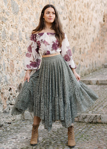 Inspired by our beloved Poesy Dress, this elegant midi-length skirt combines style and comfort in one beautiful piece. Featuring a unique irregular hemline and delicate lace accents, it adds a feminine, romantic touch to any outfit. The elastic back waist ensures a flattering and comfortable fit, while the short-length lining provides coverage and ease of movement. Perfect for both casual and dressy occasions, this skirt offers effortless versatility.