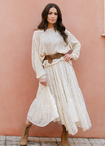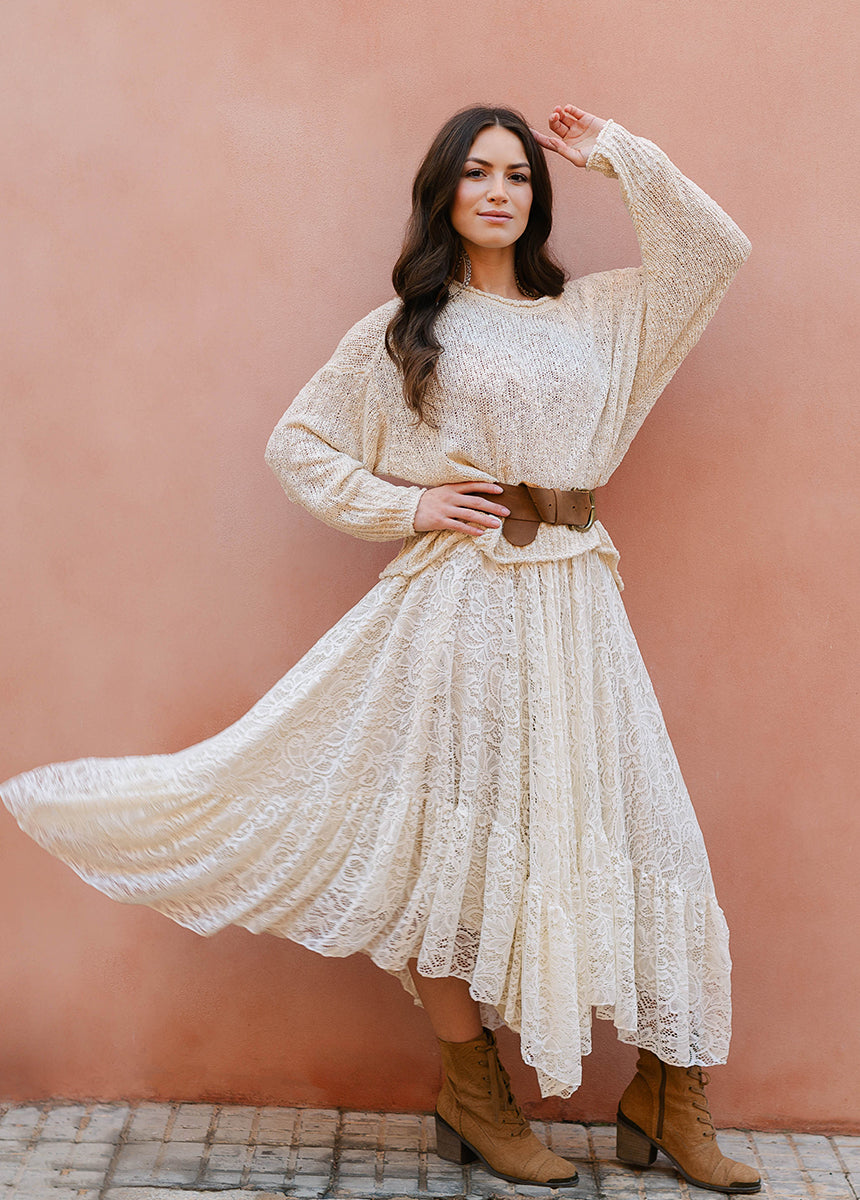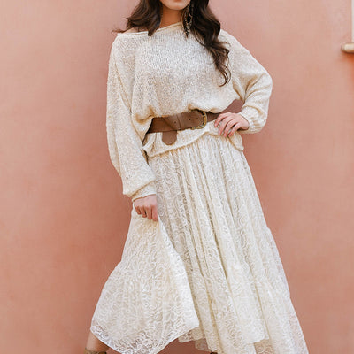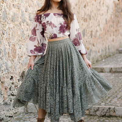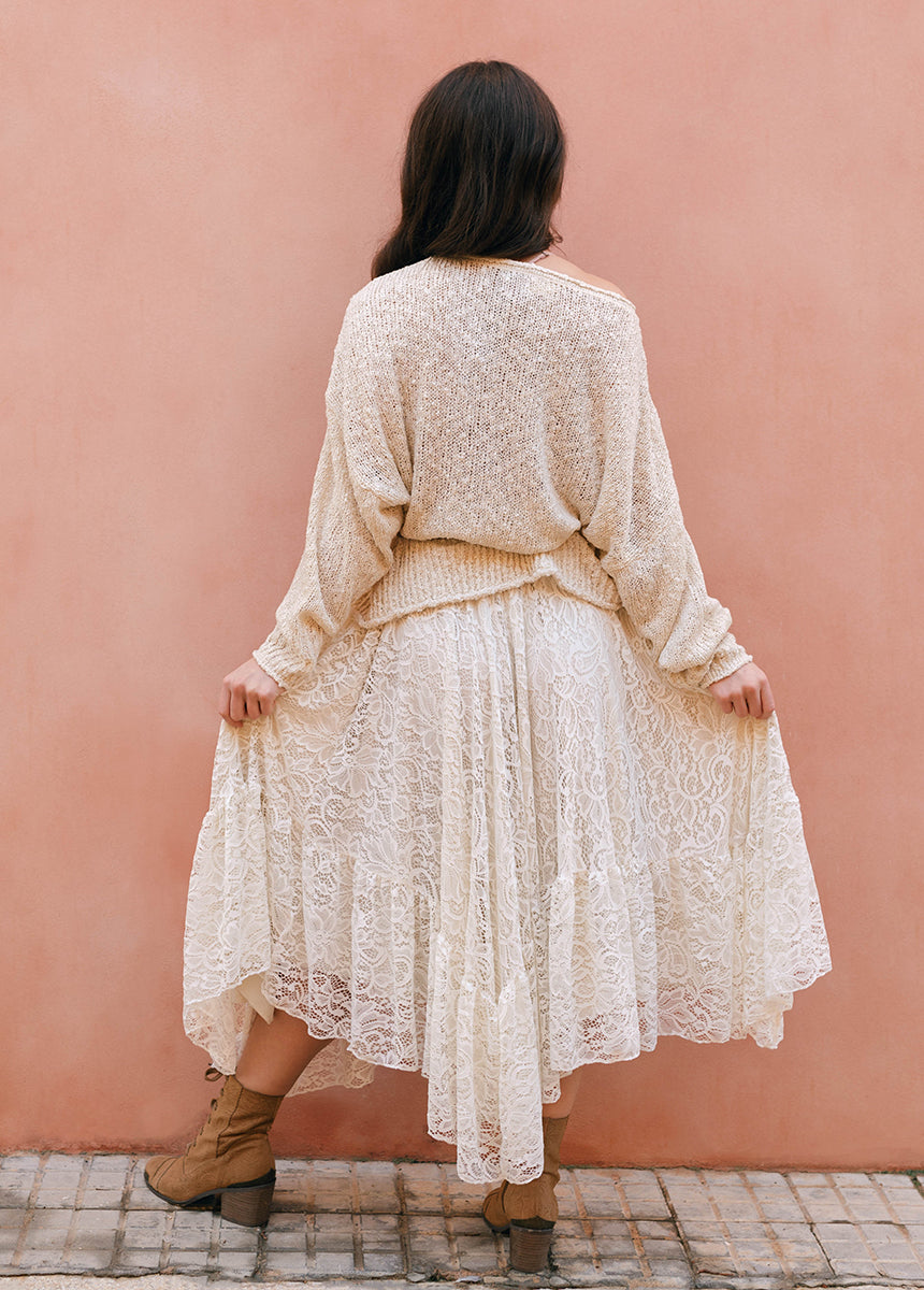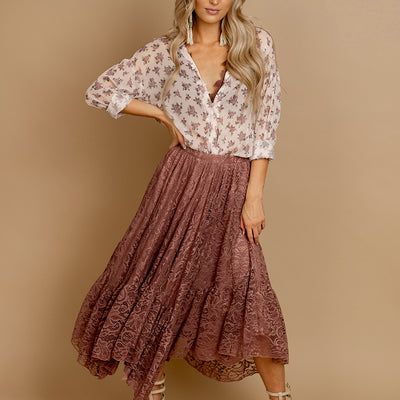 Inspired by our beloved Poesy Dress, this elegant midi-length skirt combines style and comfort in one beautiful piece. Featuring a unique irregular hemline and delicate lace accents, it adds a feminine, romantic touch to any outfit. The elastic back waist ensures a flattering and comfortable fit, while the short-length lining provides coverage and ease of movement. Perfect for both casual and dressy occasions, this skirt offers effortless versatility.