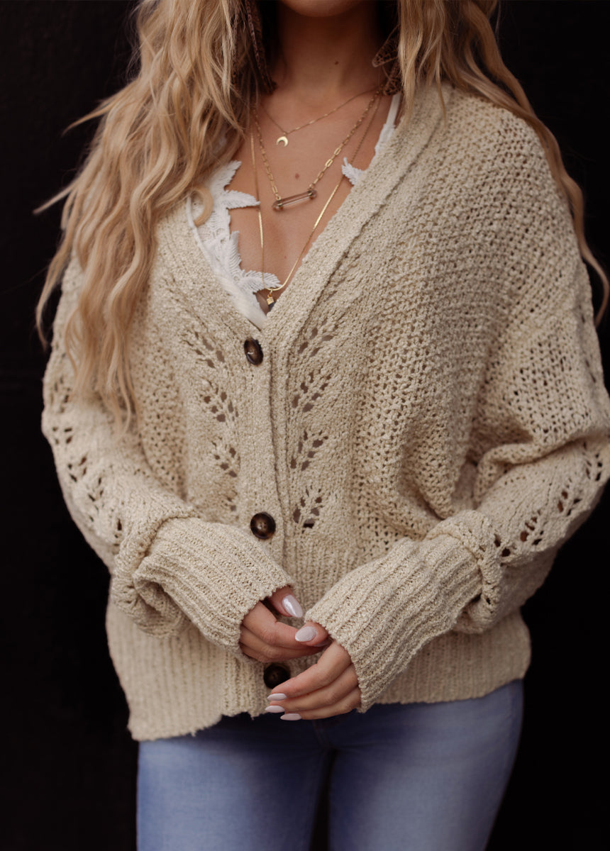 The Prudence Sweater in Ecru is designed with a beautiful open-knit leaf pattern that adds texture and charm to your look. Featuring a deep V-neckline and drop shoulders, it drapes effortlessly for a relaxed yet feminine silhouette. The front button closure is detailed with large tortoiseshell-style buttons, giving it a touch of timeless sophistication. Ribbed hems and cuffs complete the look with a polished finish that keeps its shape. Perfect for layering over camisoles or dresses, this knit brings cozy sophistication to any season.