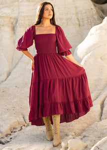 A smocked bodice and flowy skirt combine for an effortlessly flattering dress.