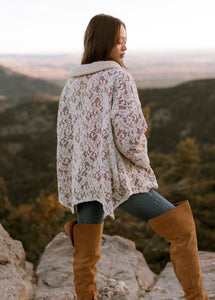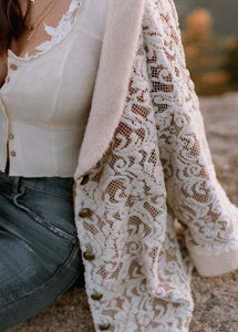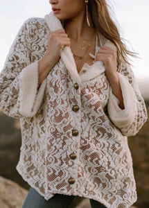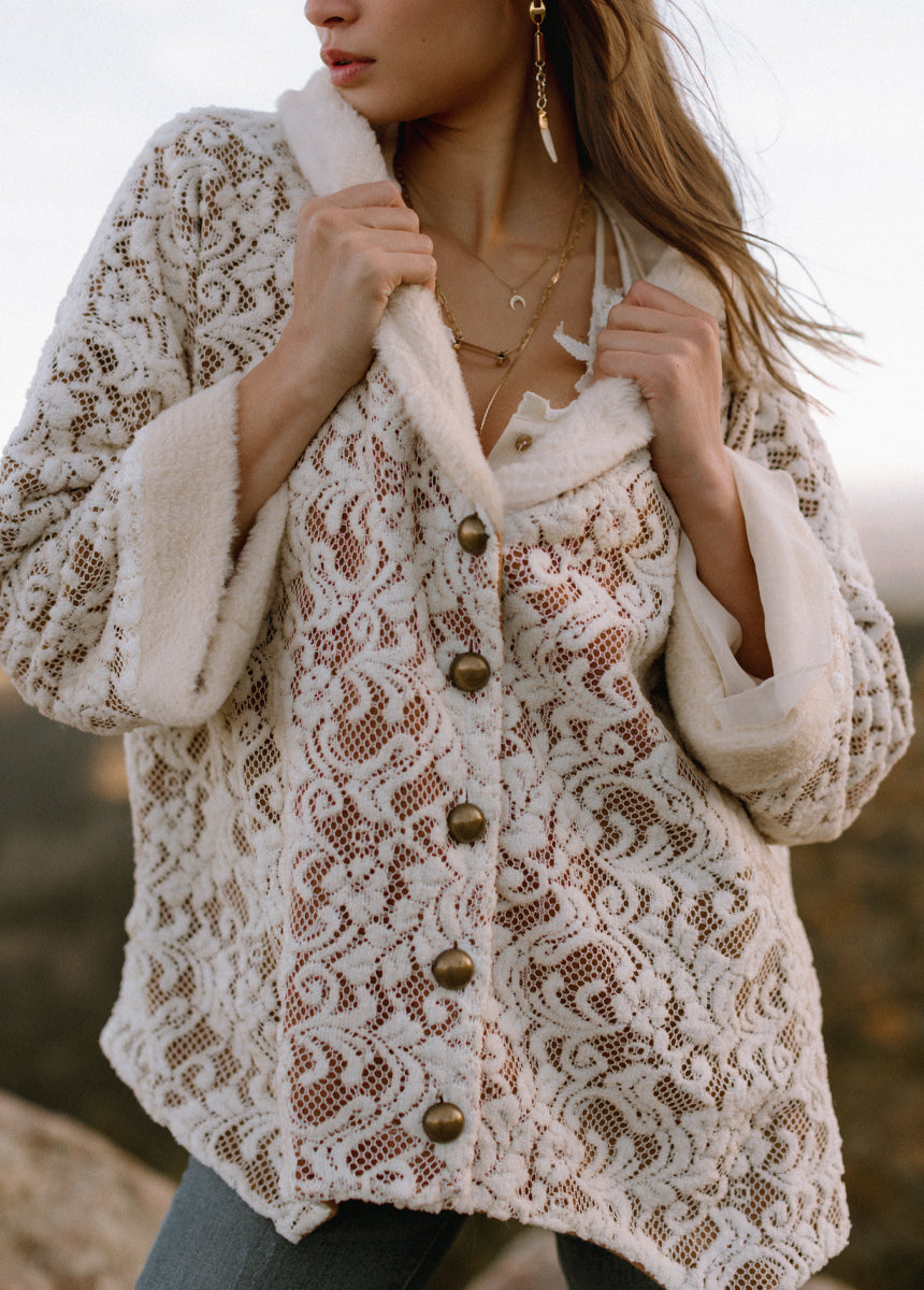 Wrap yourself in timeless elegance with this jacket trimmed in soft faux fur. The intricate floral lace overlay adds a romantic touch, while the plush faux-fur collar and cuffs bring warmth and texture. Antique-style brass buttons run down the front, adding a hint of vintage charm. Its relaxed, slightly oversized fit makes it perfect for layering over dresses or blouses. Feminine yet cozy, this jacket is a beautiful statement piece for chilly days.