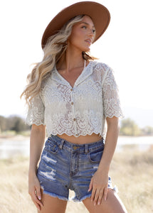 The Raina Top in Barely Blue is perfect for layering with its mesh lace detail. Get creative with your outfits while adding a touch of playfulness to your look.