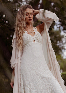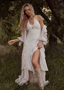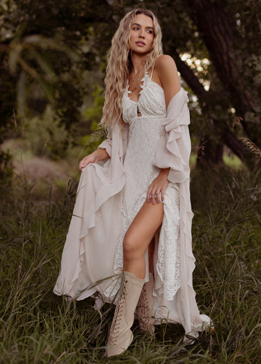 My husband and I are renewing our vows next year and took pictures for our invites/save the dates. I chose this dress for its elegance yet laid back and going for the boho/laid back fall mountain theme we are going for. The dress is true to size and worked well in the wind! I am 5’7, 130, 32A, 26” waist, 37” hips and the Small was perfect!