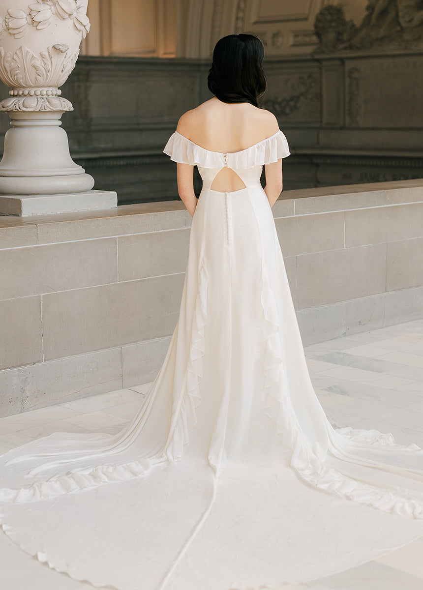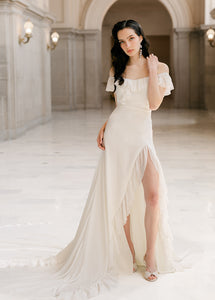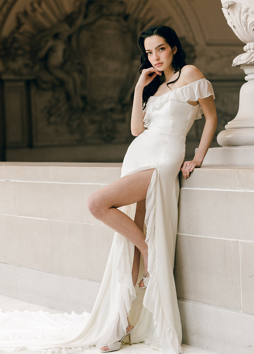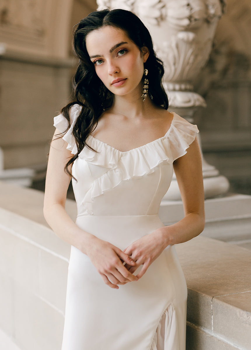 Meet Renatta, a creation for the bride who seeks effortless drama, clean lines and balanced proportions. This gown comes to life with movement, the soft waves of floaty chiffon ruffles dance with lightness in combination with the sleek drape of the crepe fabric creating romance as you walk. The high cut waterfall ruffle slit will accentuate your best assets and have you dancing til dawn.