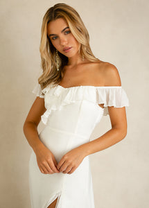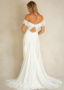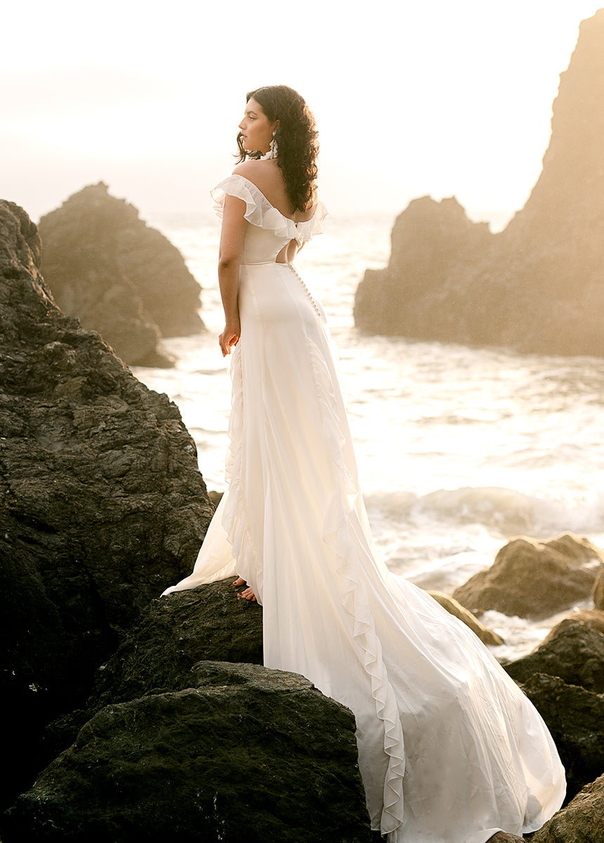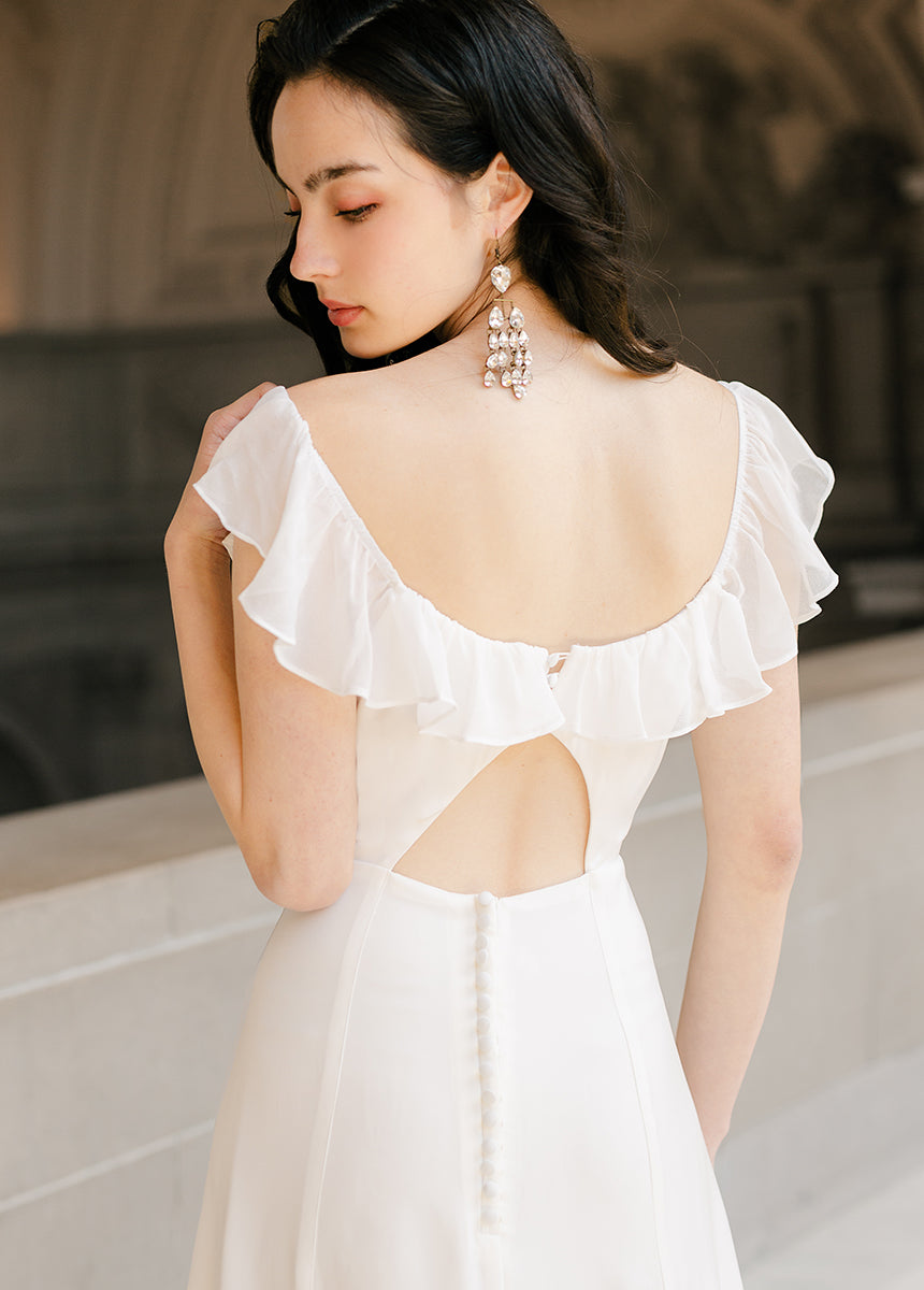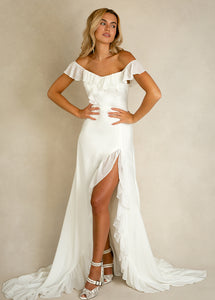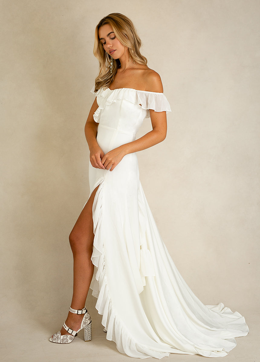 Meet Renatta, a creation for the bride who seeks effortless drama, clean lines and balanced proportions. This gown comes to life with movement, the soft waves of floaty chiffon ruffles dance with lightness in combination with the sleek drape of the crepe fabric creating romance as you walk. The high cut waterfall ruffle slit will accentuate your best assets and have you dancing til dawn.