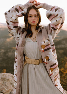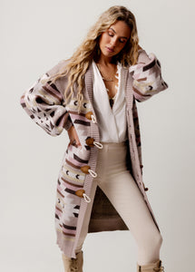 This full-length sweater is a cozy, below-the-knee layering piece designed for effortless boutique style. Its relaxed, loose-fitting silhouette features full-length sleeves with a slight puff and gathered cuffs for added charm. A wide shawl collar folds over beautifully, adding warmth and elegance to any outfit. Toggle closures with loop and button-style fastenings run down the front for a rustic, handcrafted feel. With smooth vertical ribbing on the placket, hem, and cuffs, and a more intricate knit pattern on the body and sleeves, this statement cardigan blends comfort with elevated texture—perfect for modern women’s boutique fashion.