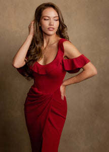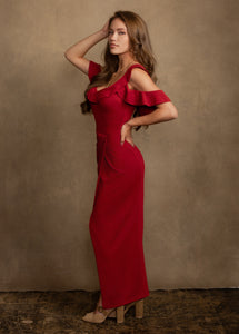 The Rissa Dress blends romantic drama with an effortlessly feminine silhouette. It features a deep V-neckline in both the front and back, balanced by narrow shoulder straps and off-shoulder ruffles that create a soft, layered look. The bodysuit-style top offers a smooth, secure fit that stays perfectly in place. A faux wrap skirt adds elegant movement and beautifully enhances the waistline. Finished in a flowing maxi length, this dress is ideal for special occasions, evening events, or any moment you want to feel unforgettable.