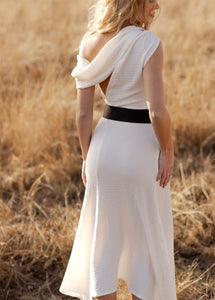 This statement piece features a striking one-shoulder neckline with an angled cut across the bust for a modern, sculpted look. Soft knot pleating and draped detailing at the shoulder create elegant movement and a flattering focal point at the front. The open-back design is beautifully framed with draped crossover fabric, adding drama while maintaining a refined finish. Princess-style seam lines shape the bodice for a contoured, feminine fit that enhances your natural silhouette. Finished with an asymmetrical hemline, this design delivers elevated style perfect for evening events, special occasions, or standout boutique dressing.