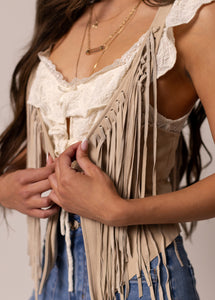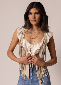This bold statement piece is designed with a deep open front and a softly shaped neckline for a striking, fashion-forward look. Vertical leather fringe detailing runs along both sides of the front, adding texture, movement, and undeniable edge. The fringe flows from the bust all the way down to the hem, creating dramatic motion with every step. Designed to be worn open, the center front has no closures for effortless layering and styling. Perfect for nights out, or standout boutique styling, this fringe piece instantly elevates any outfit.