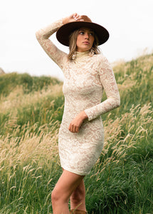 is stunning, if not even more attractive in person than it is in the photos, photographs beautifully with the lace detail, and I thought this was gonna be quite uncomfortable. I didn’t know it was two separate pieces, which was an amazingly pleasant surprise. I believe the slip is polyester, and the straps are adjustable and then the turtleneck overlay is very soft for lace, but that said I put the dress on as soon as I received it in the mail and I’m wearing the Petra necklace with it; it doesn’t seem like it’s snags, but it caused the whole chest area to pill and I’ve only had it on for a few hours, so that’s quite disappointing. Be careful wearing any jewelry w this. I’m tempted to write a three stars because I feel like we should be able to put on a necklace without it snagging like that, but it is what it is .Also iam 9 months pregnant and it went over my belly fine, nice stretchy material.
